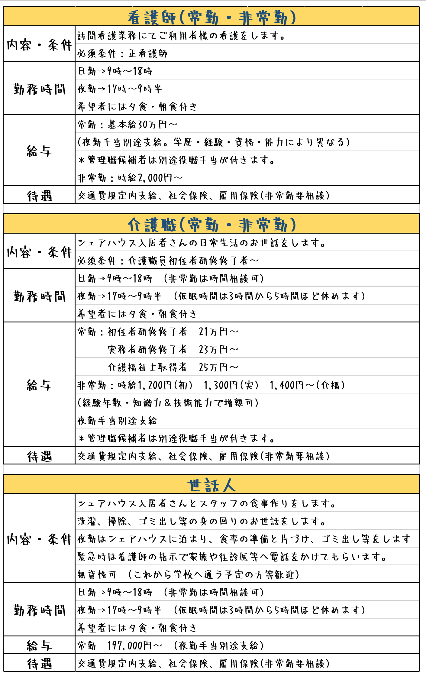 採用情報 採用情報 シェアハウスかのんでは『家での暮らし』をコンセプトにしています。時間に追われず、のんびりと働きたい方に向いている環境だと思います。また、日勤・夜勤を問わず、お子様を連れての勤務なども可能な限り応じます。出勤時間や曜日は面接の際にご相談下さい。現在、かのんでは一緒にお仕事をしていただける看護師・介護士・世話人さんを募集しております。 PAGE TOP